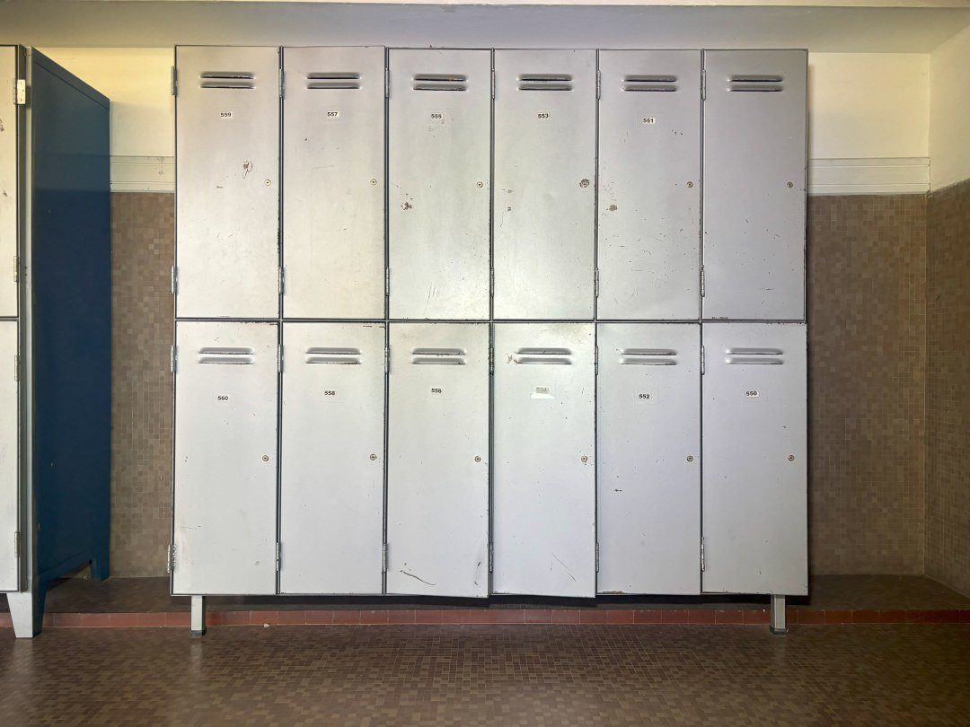 Módulo metálico que integra 10 lockers individuales, cada uno con cerradura Haffele y llave correspondiente. Equipados con rejillas de ventilación y estante interior para organización. Todos los compartimentos están funcionales. 15 años de uso en reconocido colegio de Carrasco, donde aún se encuentra en funcionamiento.